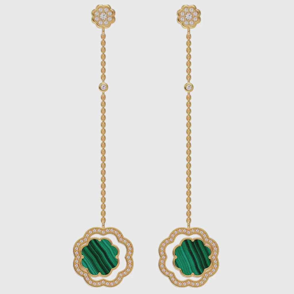 Graceful curves and thoughtful contours define the Renaissance earrings, adorned with malachite that frames the face with its lush green vibrance. The gemstone offers a poetic touch, blending simplicity with a sense of profound elegance.