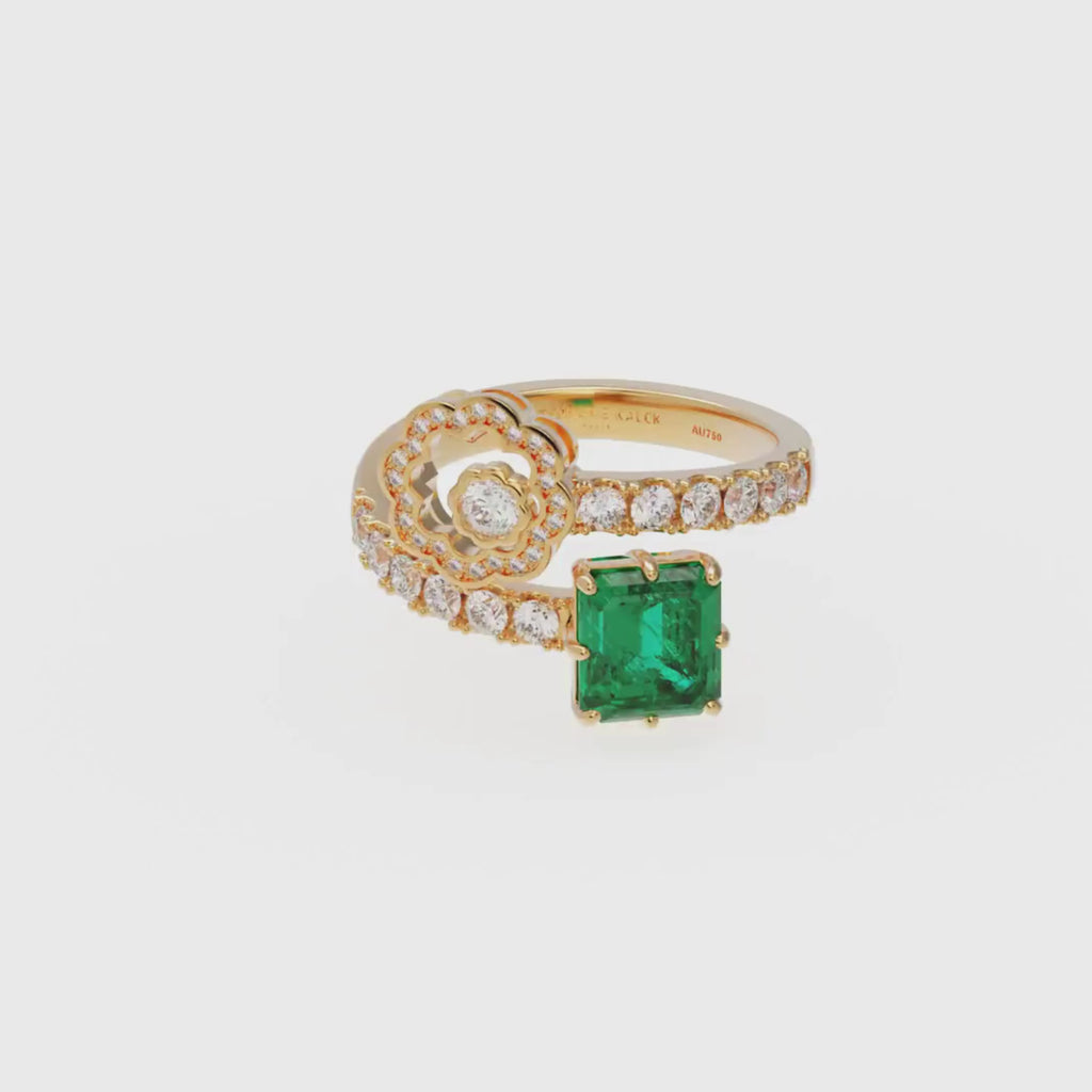 The Renaissance ring unites two worlds: a vivid emerald, rich with life, and a band of diamonds, timeless in their brilliance.