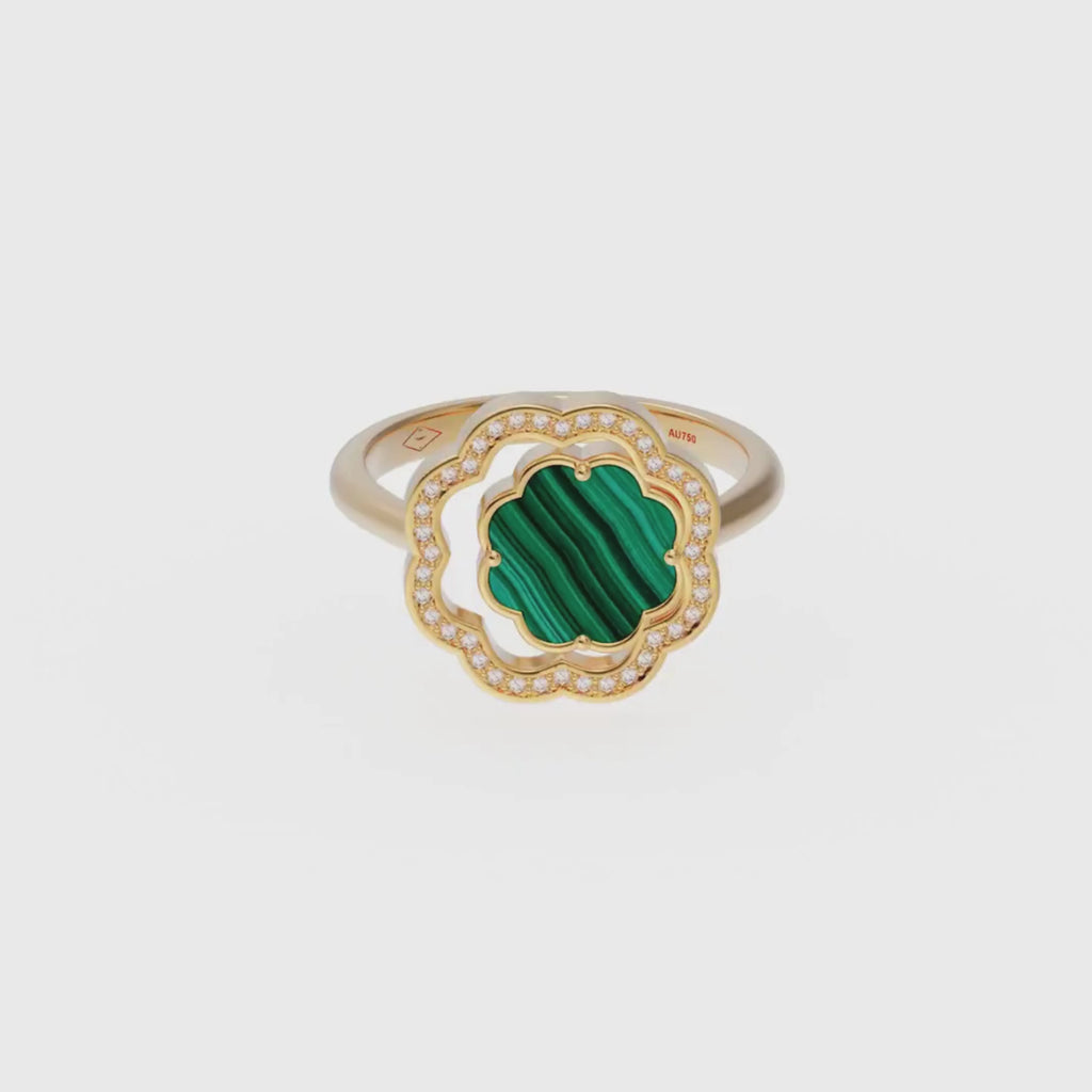 The malachite-adorned rings from the Renaissance collection weave artistry and transformation. Their elegant loops highlight the gemstone’s captivating patterns, celebrating connection while offering timeless beauty and individuality.