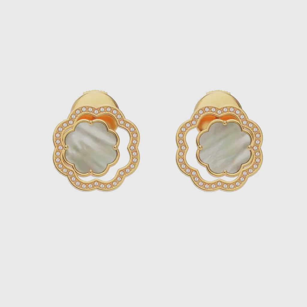Renaissance stud earrings featuring mother-of-pearl shimmer with ethereal light. Their iridescent surface adds a soft elegance, capturing the essence of timeless grace and quiet sophistication.